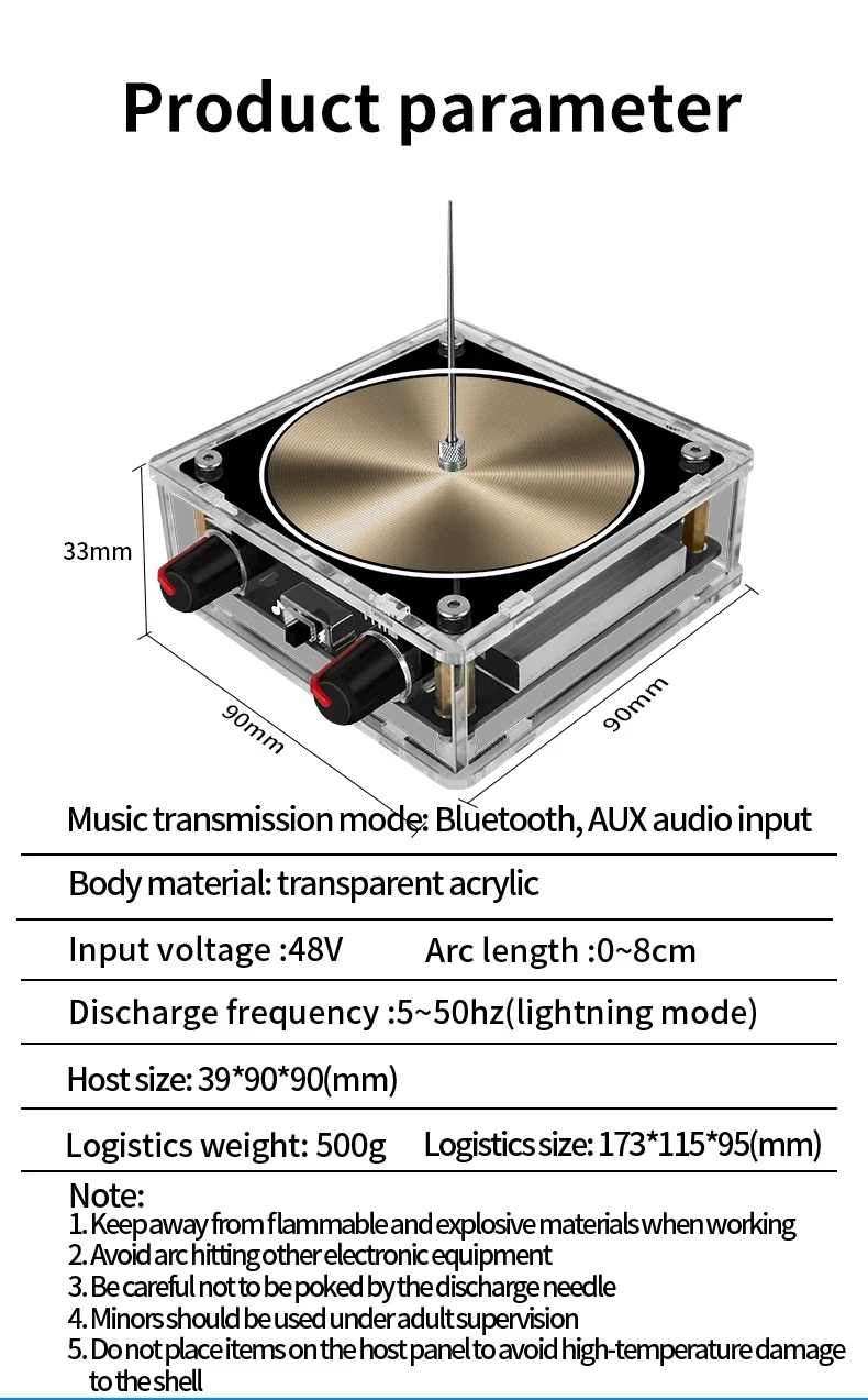 أداء أفضل ----- يتميز مكبر صوت الموسيقى هذا بتصميم حماية الدائرة، ولن يتسبب في تلف جهاز الإدخال، ويمكنه تشغيل الموسيقى بجودة أفضل من مكبر صوت البلازما القوسي، ويمكن تشغيل الموسيقى ذات الموجة المربعة فقط.